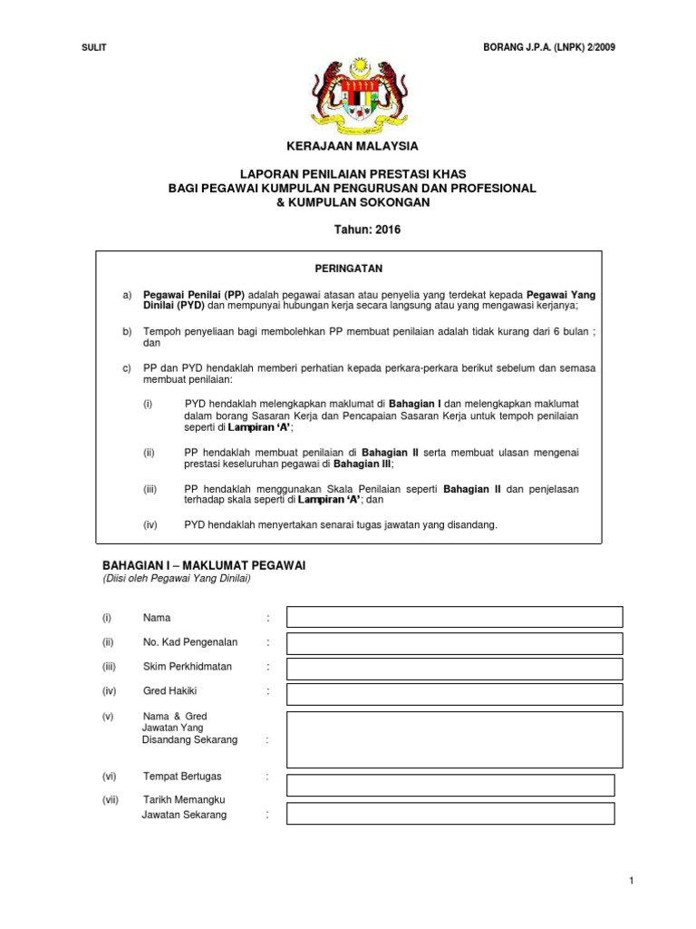 Pengukuran penilaian prestasi pembekal kpdnkk negeri pahang bagi 1 januari hingga 31 disember 2015. Bengkel peserta akan diberikan sijil khas. Lnpt akademik pentadbiran dalam fakulti (jusa/ds54/53/52/51/45). Borang laporan penilaian prestasi khas download google average ratng: Proses penilaian prestasi di kumpulan pendidikan ypj akan dilakukan sekali pada setiap tahun bagi tujuan kenaikan pangkat, kenaikan gaji dan pemberian proses pengisian borang penilaian prestasi.