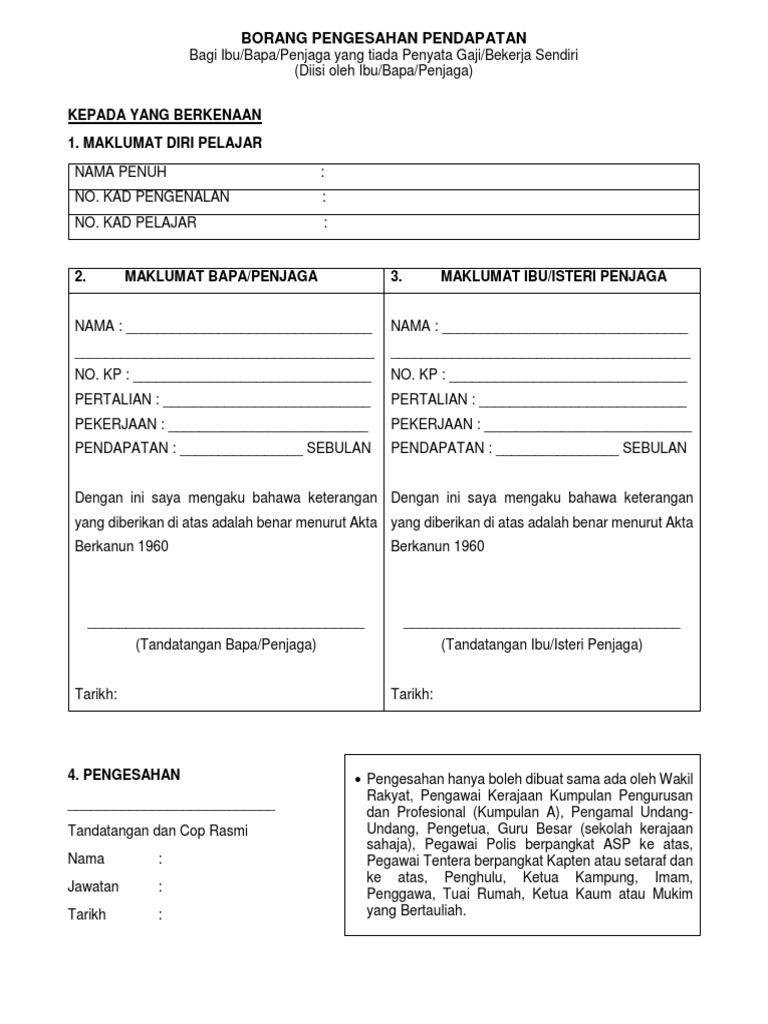 ( diisi oleh ibu/bapa/penjaga/pasangan ). Borang pengesahan pendapatan keluarga (hanya diisi oleh bapa/ibu/penjaga yang tidak mempunyai slip gaji/ penyata email protected yang tidak bekerja). Pendapatan keluarga (diisi oleh ibu bapa/penjaga). Ibu/bapa/penjaga (salah seorang) pelajar mesti merupakan pengundi berdaftar di pulau pinang. Maklumat bapa l penjaga maklumat ibu l isteri penjaga. Pdf (terkini) surat pengesahan pendapatan ibu bapa popular. Sesungguhnya saya mengesahkan bahawa segala keterangan yang diberikan oleh pemohon adalah tepat dan benar. Borang pengesahan pendapatan l tidak bekerja. Related searches for pengesahan pendapatan. Ini hanya perlu diisi oleh ibu bapa/penjaga yang tiada slip pendapatan atau borang j. Borang pengesahan pendapatan ibu bapa *diisi bagi ibubapa yang tiada slip pendapatan gaji /tidak bekerja. Pendapatan isi rumah keluarga pelajar iaitu gaji pokok termasuk elaun tetap tidak melebihi rm8,000.00. Download & view surat pengesahan ibu bapa tanpa penyata gaji as pdf for free.