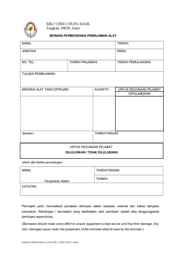 1 from Borang permohonan lesen tred dan papan tanda. Borang permohonan perlu dikemukakan ke pejabat ketua seksyen pembangunan pelajar selepas menghantar borang permohonan kelulusan aktiviti pelajar (upm/hepa/bhep/upap/b001) kepada penyelaras. Download contoh surat pinjaman uang kepada perseorangan format 1653 x 2339 contoh surat perjanjian hutang piutang pelunasannya format 1131 x 1600 pixel download surat permohonan pengajuan pinjaman format 768 x 1087 pixel download surat permohonan peminjaman. Rekod pinjaman alatan/abm makmal/bengkal kemahiran hidup bil tarikh nama peminjam jenis alatan kuantiti guru tarikh t.tangan t. Pembeli akan membuat pesanan barang niaga dengan menghantar borang pesanan belian kepada penjual. Jumlah terakhir pinjaman akan diluluskan berdasarkan kelulusan akhir pihak bank. Tenure tempoh 24 months bulan bulan 36 months bulan 60 months,. Form peminjaman barang/peralatan nama kegiatan :