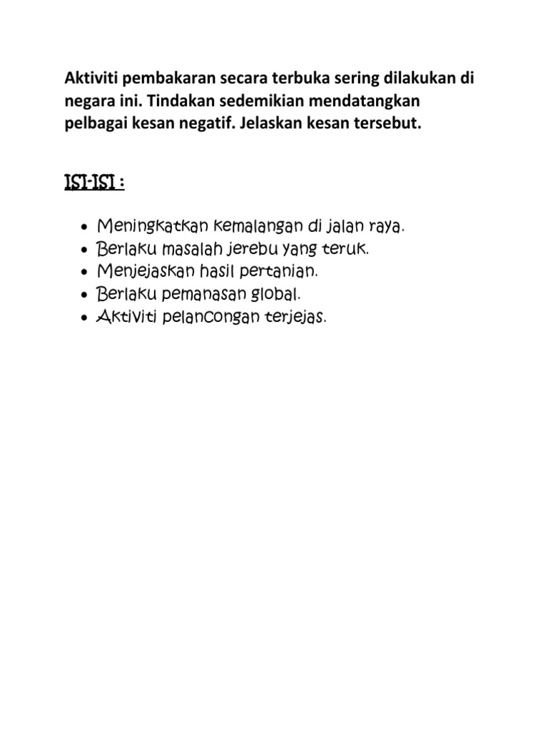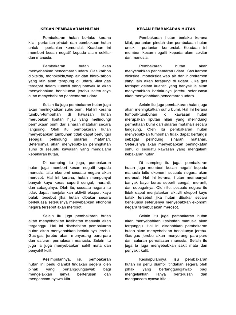 Kesan jerebu yang paling membimbangkan ialah masalah pencemaran udara.keadaan ini disebabkan banyak partikel terampai yang terapung dan terperangkap di udara sehingga menyebabkan indeks udara mencapai tahap tidak sihat. Aktiviti pembakaran secara terbuka sering dilakukan di negara ini. * jarak penglihatan berkurangan yang boleh membahayakan pengguna jalan raya. Informasi tentang contoh karangan, karangan adalah sebuah karya tulis yang berbentuk prosa naratif fiktif. Banyak pembakaran terbuka yang telah dilakukan oleh individu yang tidak bertanggungjawab.