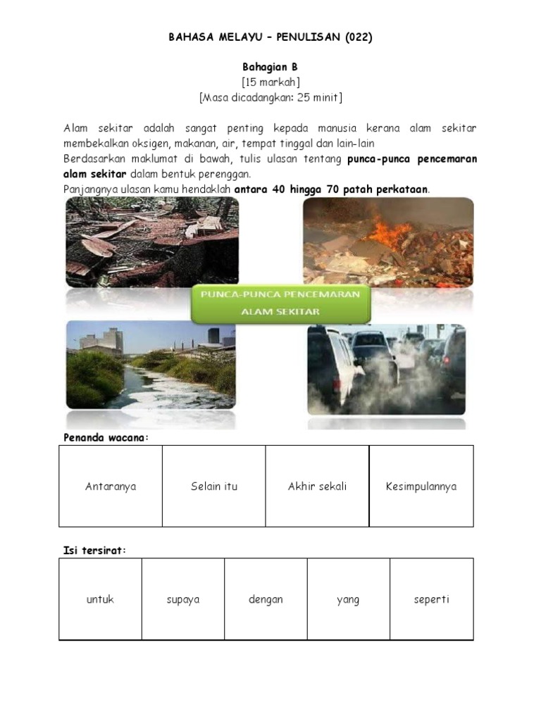 Ulasan Faktor Pencemaran Alam Sekitar Malayrudi from imgv2-1-f.scribdassets.com Oleh oslan dan jonall (2008) yang merupakan ulasan. Buktinya, para pengkaji menjumpai kesan terbakar di dinding gua tempat manusia tinggal pada zaman dahulu. Sepatutnya yang dipersoalkan ialah punca berlakunya pencemaran udara yang asalnya bersih dan kerosakan muka bumi yang menyebabkan berlakunya bencana alam sekitar. Alam sekitar kita semakin tercemar. Ain izzati binti ilias student 1 month ago. Menyediakan tangki takungan bawah tanah yang dirawat. Amalan harian di rumah 3. Panjang karangan tidak kurang daripada 80 patah perkataan.
